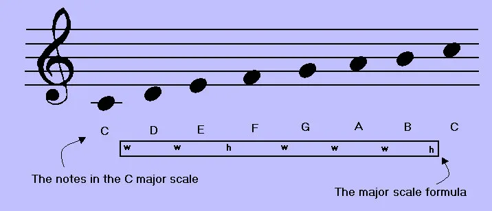 A scale is just a ladder of notes that sound good together. The Major Scale is built using a specific pattern of Whole Steps (W) and Half Steps (H).