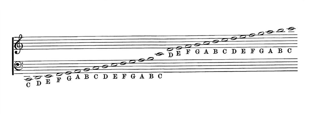The musical “ladder” is called the Staff. It consists of 5 horizontal lines and the 4 spaces between them.